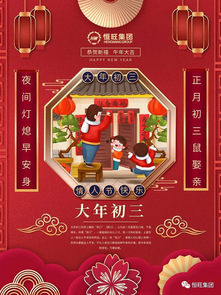 根据我国古代的传说,大年初三是“老鼠娶亲”的日子,所以相传入夜后,就必须早早熄灯就寝,让老鼠家族们举行婚礼,并在家中各处撒盐与米,意思是要与“老鼠分钱”。